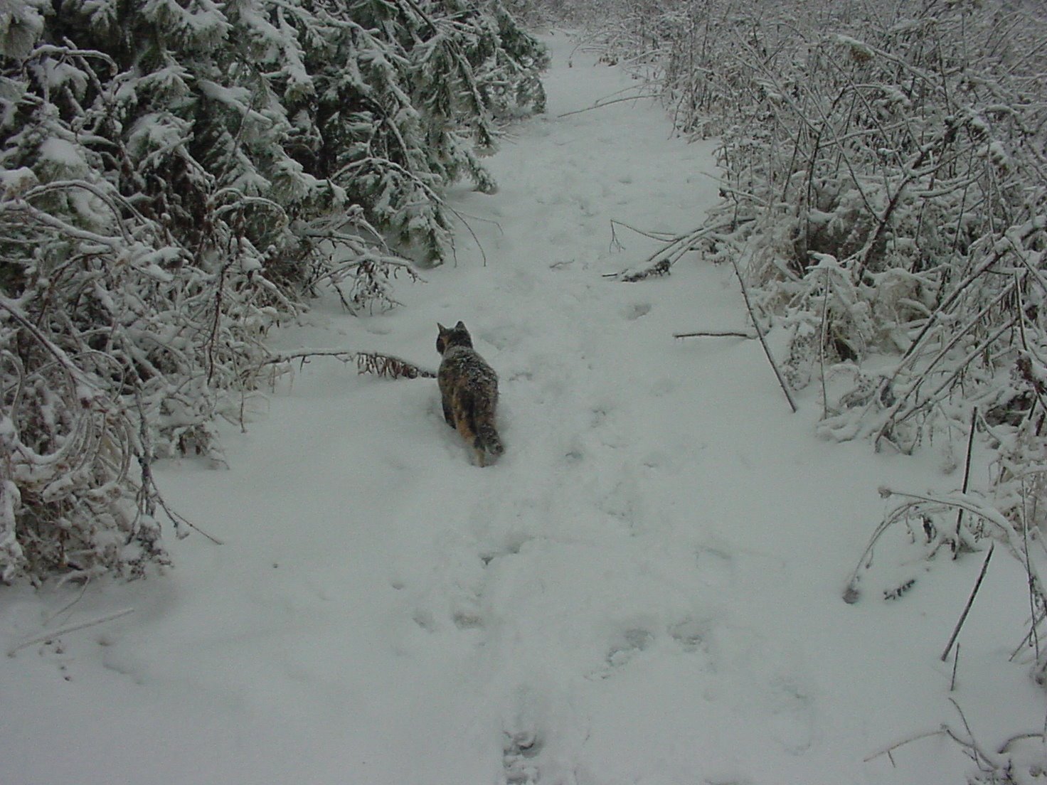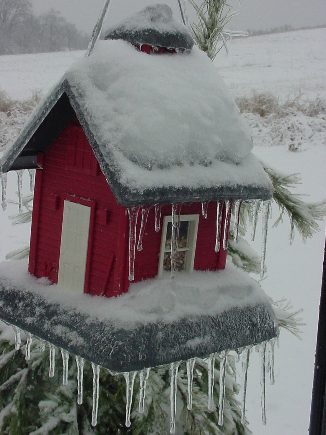 Bird feeder with no birds. The problem is a combination packed snow and ice and one talented feline.