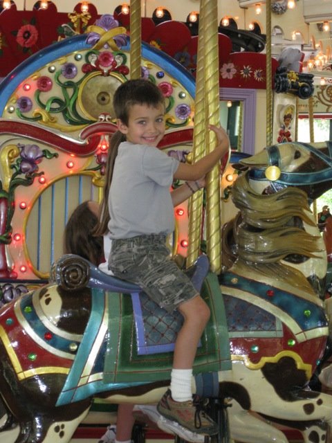 Christopher on the 1914 Carousel. Samuel cried when it was over not wanting to get off.