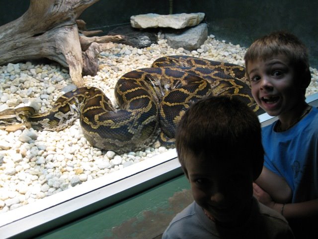 Anthony and Christopher in mock fear of the python, boa, I don’t know….big snake!