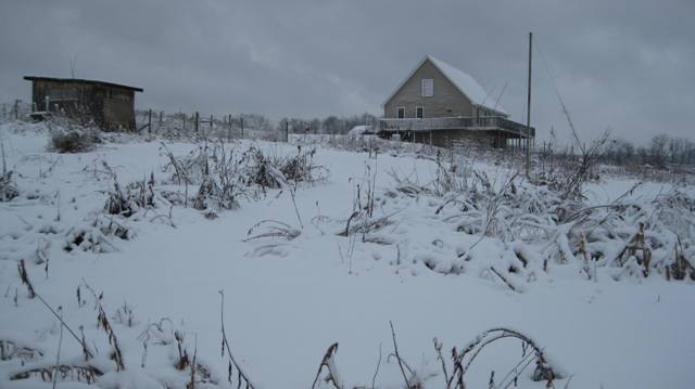 Our house and chicken coop. The hop pole is visible too, tear…can’t wait till summer.