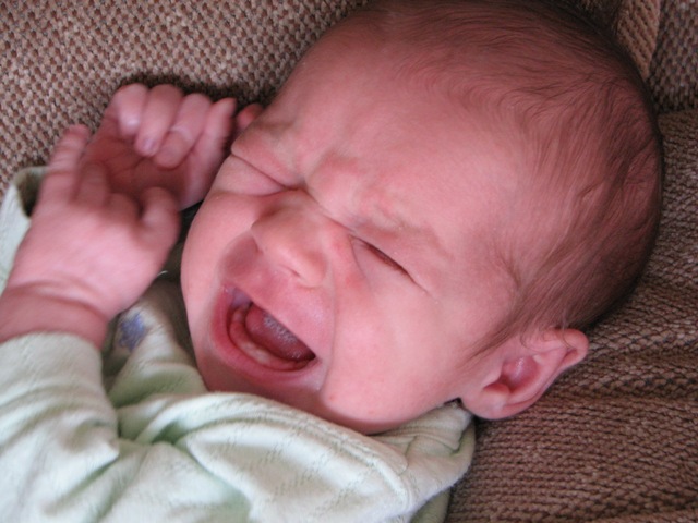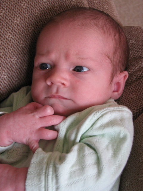 Daniel is now 2 weeks old and is doing very well. He now weighs somewhere between 8.5 to 9 lbs. He likes to eat…a lot. Here is a picture of Daniel, quiet, content, and I think he might be smiling a little.