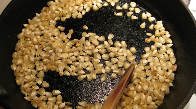Take a skillet, iron works best, and coat it with a very thin layer of oil or cooking spray.  I spray my iron skillet and then wipe it out with a paper towel.  Put the skillet over medium heat and then pour in enough corn to only cover the skillet bottom.  You will need to almost constantly stir the corn so it doesn’t scorch.  Stir until golden-brown, add some salt (popcorn salt is the best), then enjoy with a nice warm cup of apple cider.