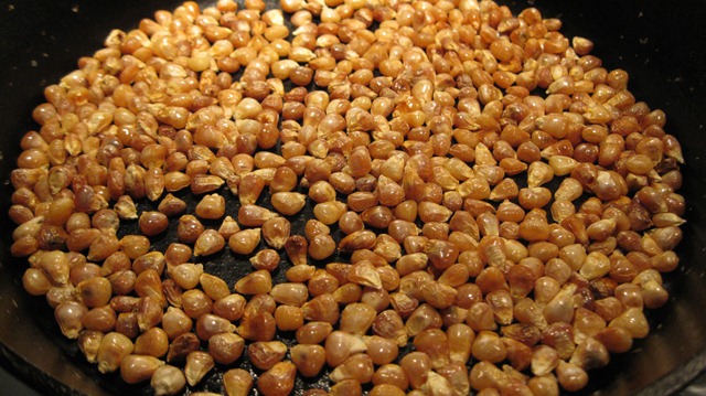 | Dried sweet corn added to a lightly oiled iron skillet. |