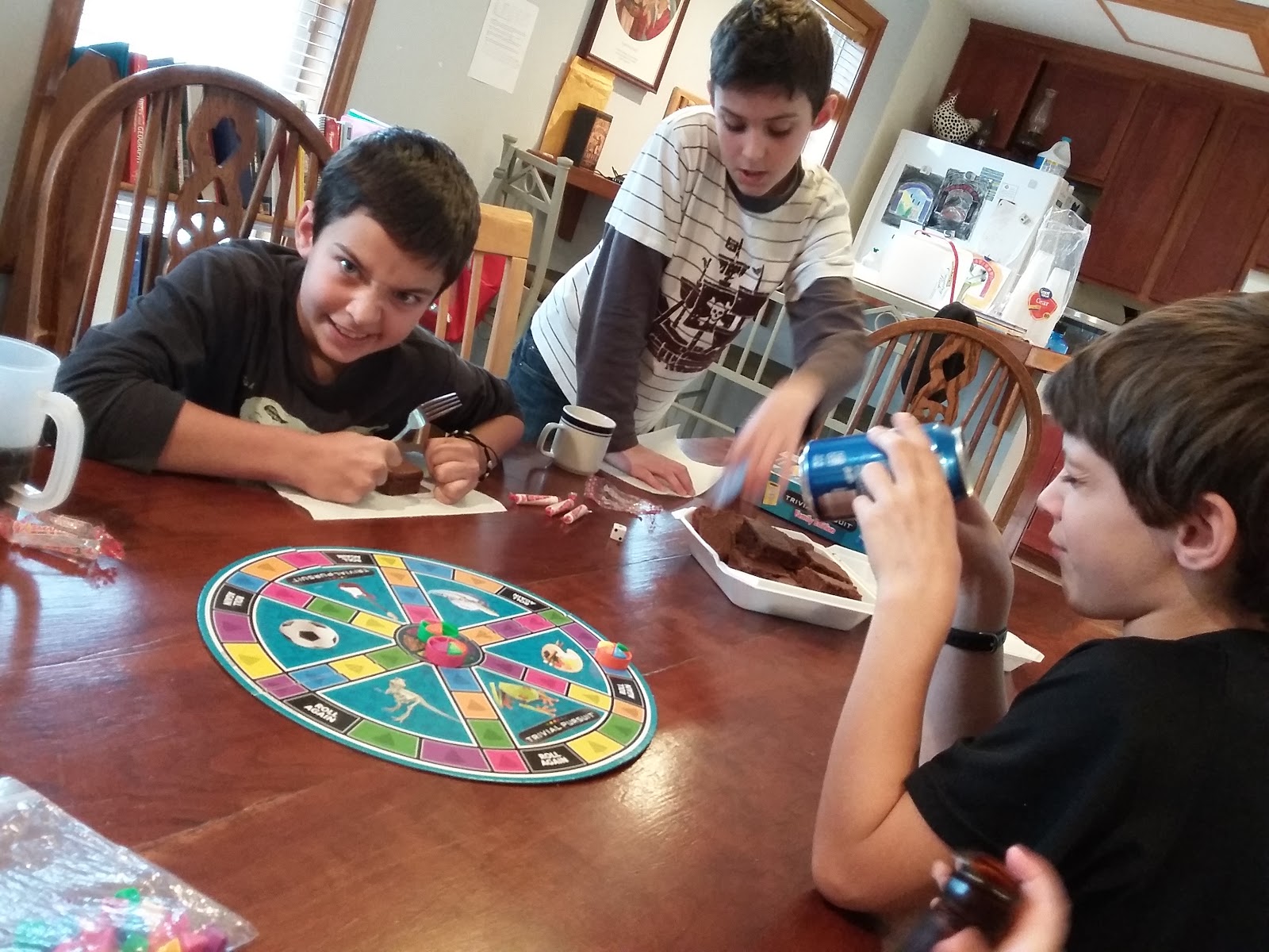 The trivia didn’t stop on Saturday night though. My kids wanted to compete for candy and prizes so we continued the weekend with Trivial Pursuit, coffee, brownies and candy on Sunday after Mass.