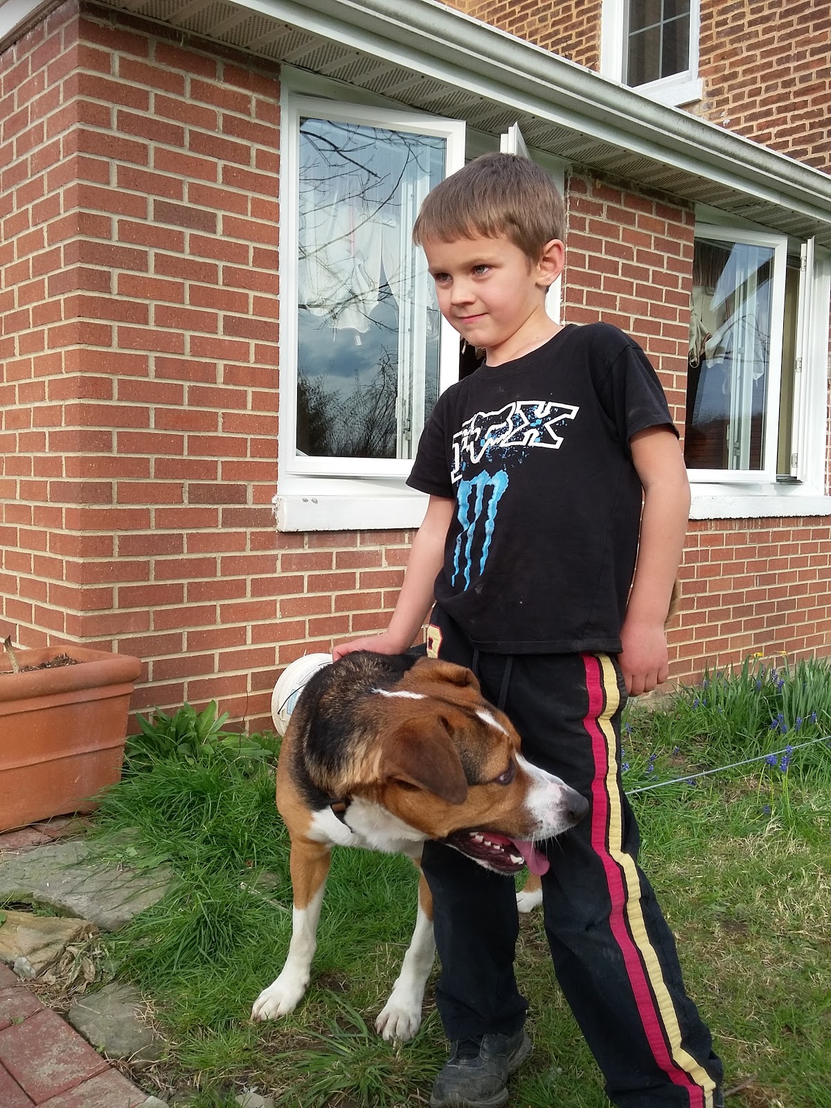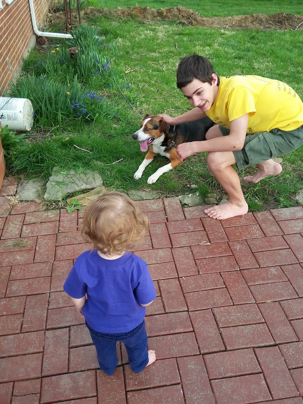 Later in the afternoon, after a much needed nap (by me), we went next door to my parents for Easter dinner. My brother, Fr. Hahn, had found a stray while hiking and brought him to dinner. The kids loved him. After dinner we celebrated the birthday and other momentous events in the life of the Hahn family. Looks like I’ll need to make more room on header for the blog…