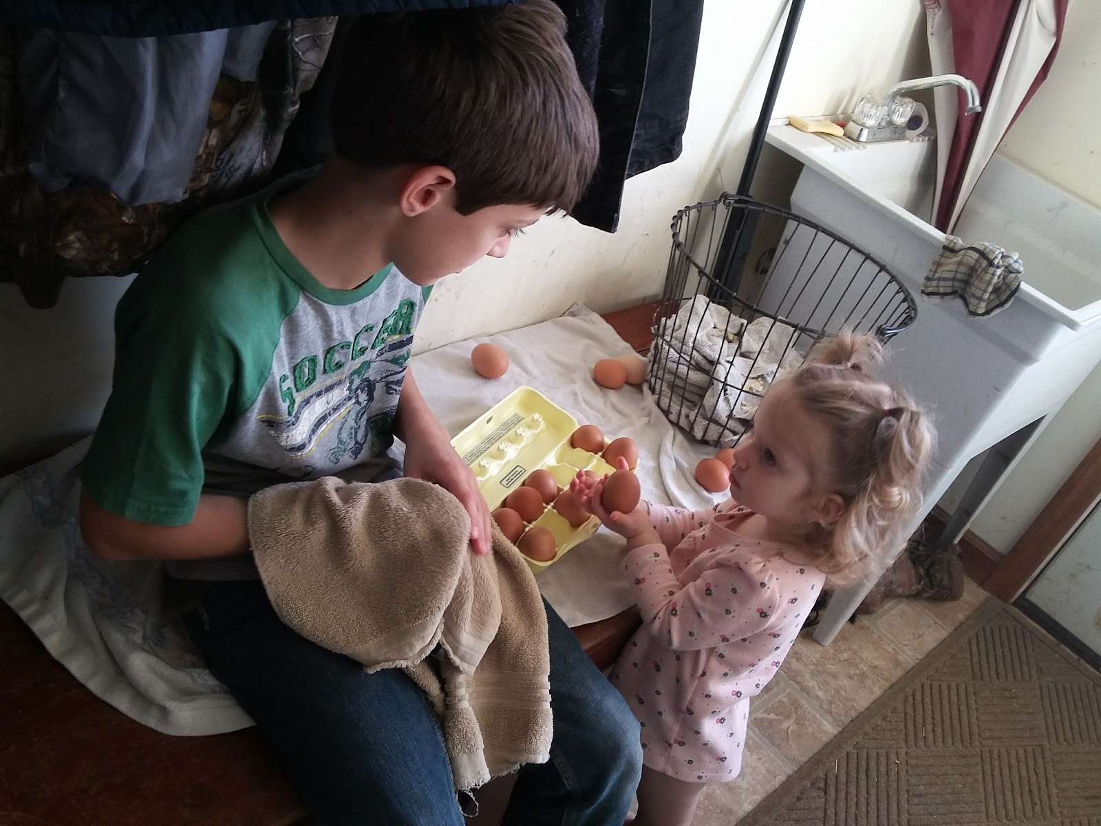 | S & B cleaning eggs to sell for Amazing Grasses. |