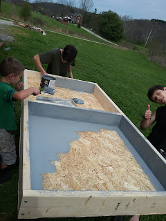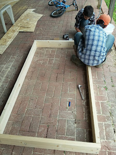On the bottom of each frame we’ve stapled and glued a 1/4″ OSB (not Order of Saint Benedict) board. On the top we’ll have 15/16″ plywood. The plywood will be hinged allowing for it to be lifted and revealing two 37x40x6 storage compartments for all the junk these pack-rats collect.