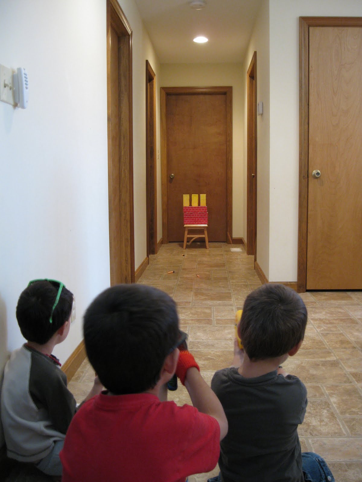 In those few moments since the unfortunate “incident” she was able to arm herself and rally a small group of guerrilla fighters. I was outgunned and outnumbered but confident in my abilities. I took a throw pillow and tossed it up in the air hoping to draw their fire while at the same time I jumped up and took aim at one fighter who was caught out in the open gathering ammo. I quickly grabbed the next dart and reloaded. A barrage of darts sped by me as I quickly made my way backwards down the hall and into the bathroom. I frantically locked the door, fumbled for the light, and assessed the situation. Two darts left. Fighters in the hall gathering spent darts. Dang it! I should have grabbed those before hunkering down. I stood in the bathtub, behind the shower curtain, waiting for my opponents to bust down the door or at least use the key to unlock it.