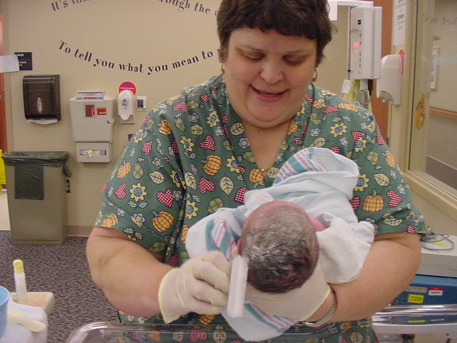 | My Aunt Jill, a pediatric nurse, giving our 3rd son, William, his first bath (2004) |