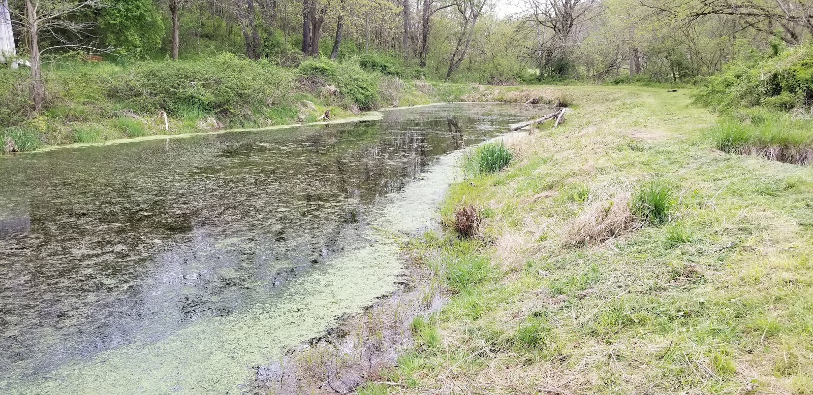 | Pond freshly weed wacked on the left side. Now to get rid of the green stuff in the pond, patch a hole, and improve some water flow into it so we can start catching fish again. |