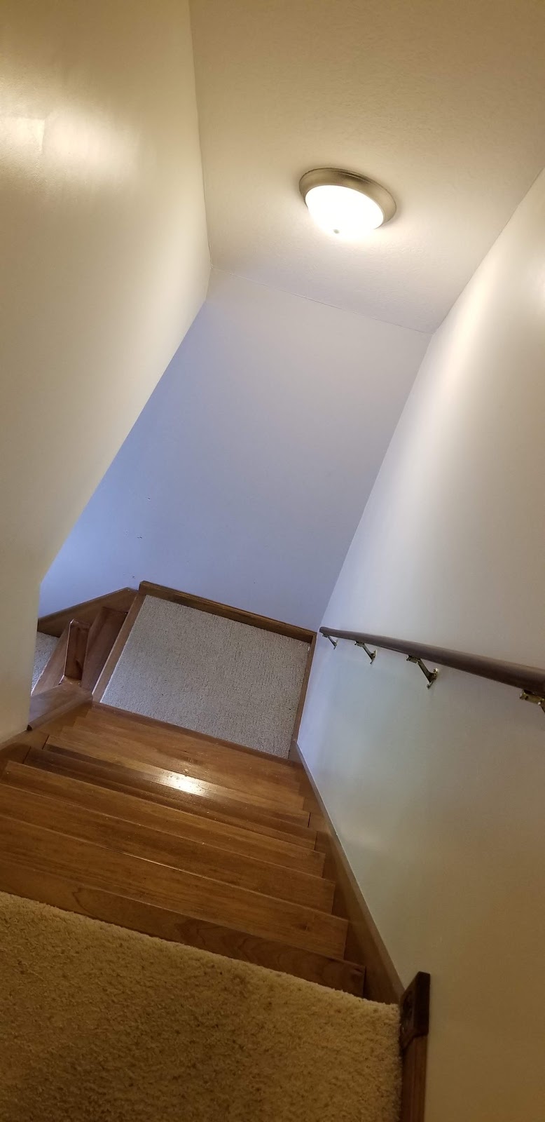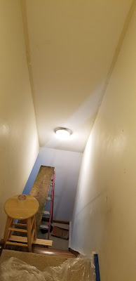 While I was installing the back splash she was busy taping and painting the upstairs hallway and stairwell. After fifteen years and 6 boys running up and down these stairs and hallway it was time for some fresh paint. Add to that an upcoming visit from family and it seemed like the perfect time. (Left photo not OSHA approved)