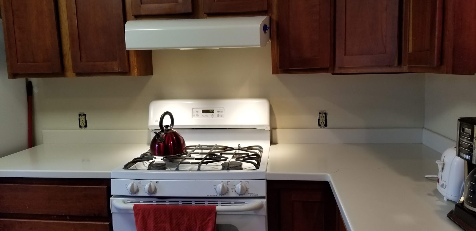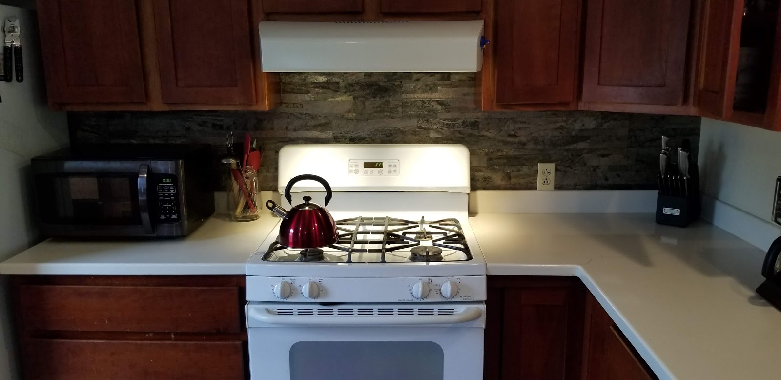 We (Nicole) decided the area behind the stove needed a makeover so I spent the better part of a day installing this nice stone back splash. I think it turned out well.