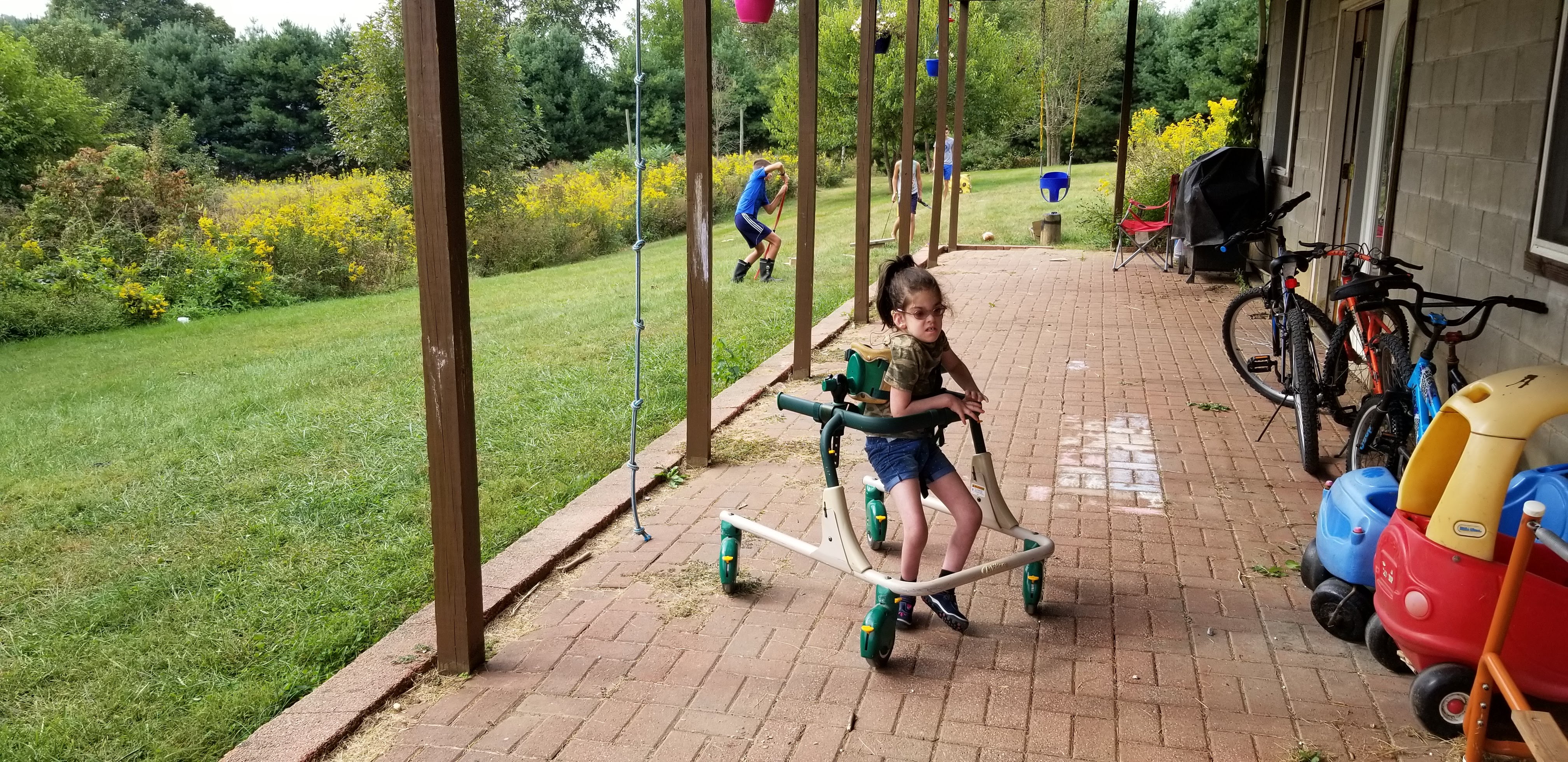 Catherine is online schooling for the time being due to the pandemic so part of her school work is to get in the walker. She doesn’t like to get in but often doesn’t want to get out either. This sort of work can help her coordination as well as strengthen her muscles and bones.