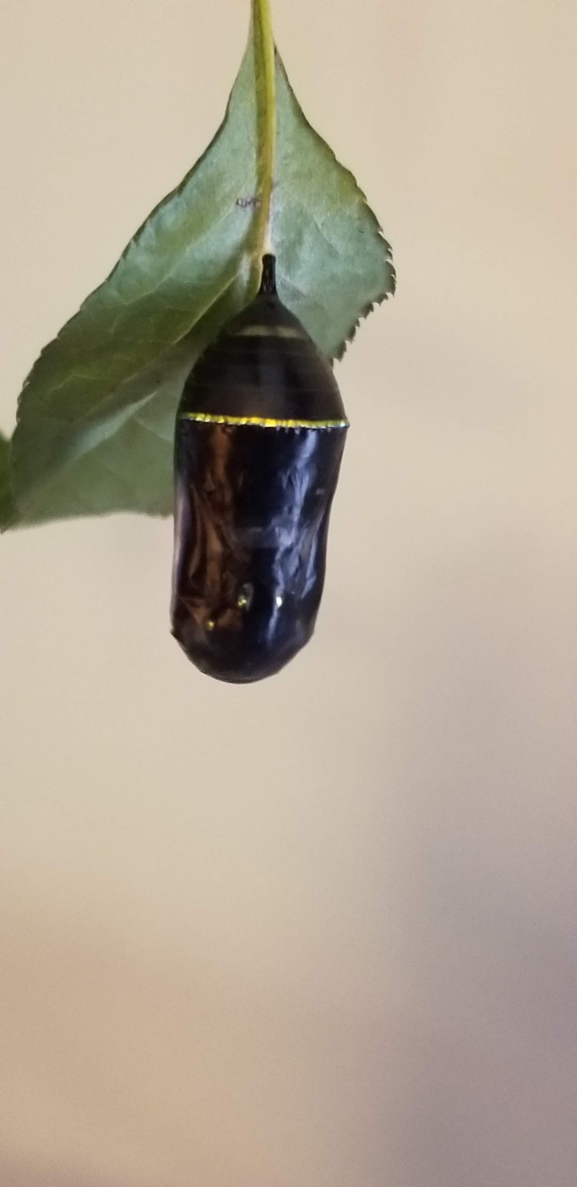 tagging kits here. This image is a monarch chrysalis shortly before the butterfly emerges. The black comes from the coloring of the wings inside a folded up, ready to burst forth. Up until this point it looks like a pale green emerald trimmed in gold.