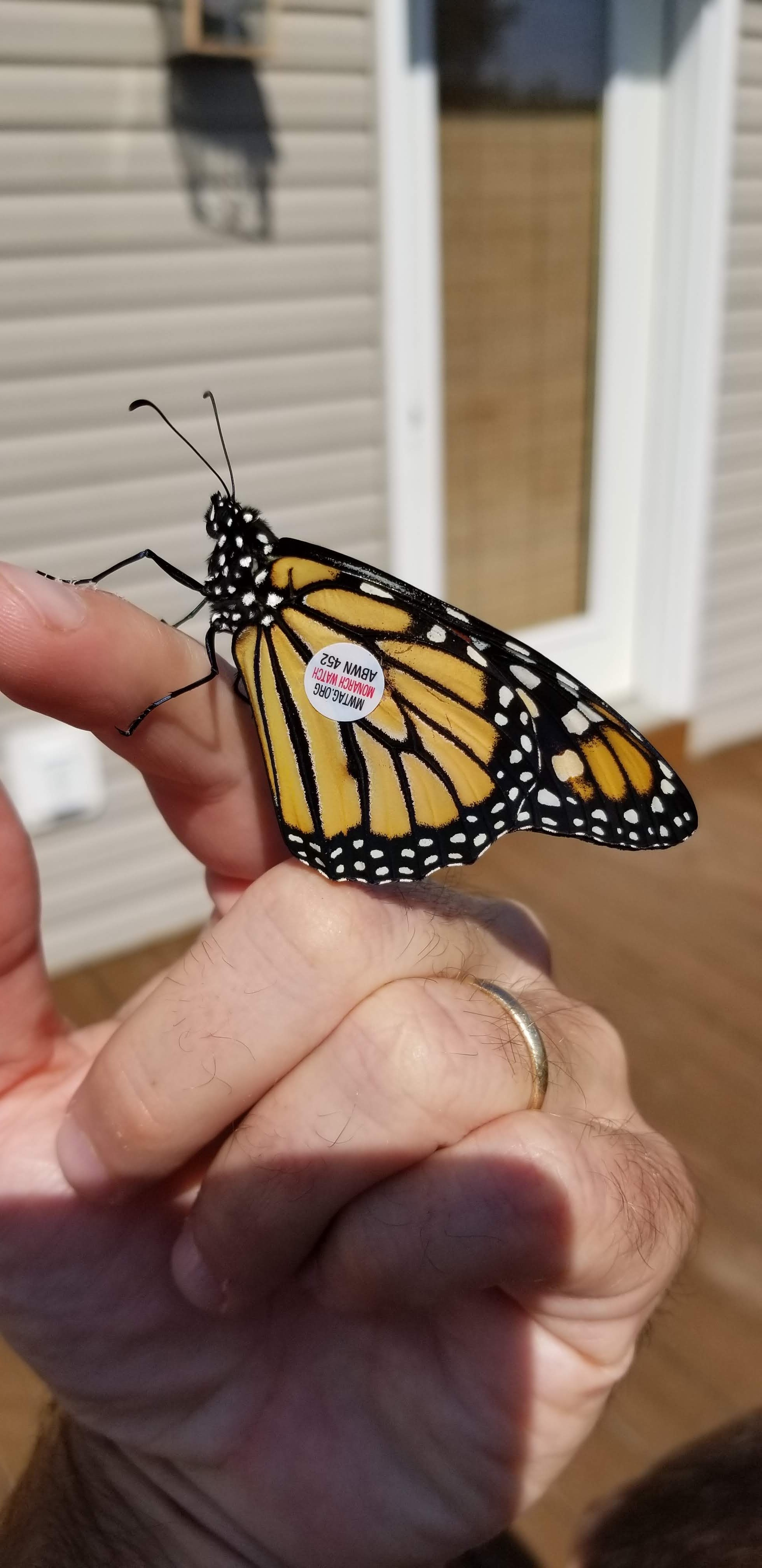 Here’s one of our butterflies raised in the house with a tag ready to head to Mexico!
