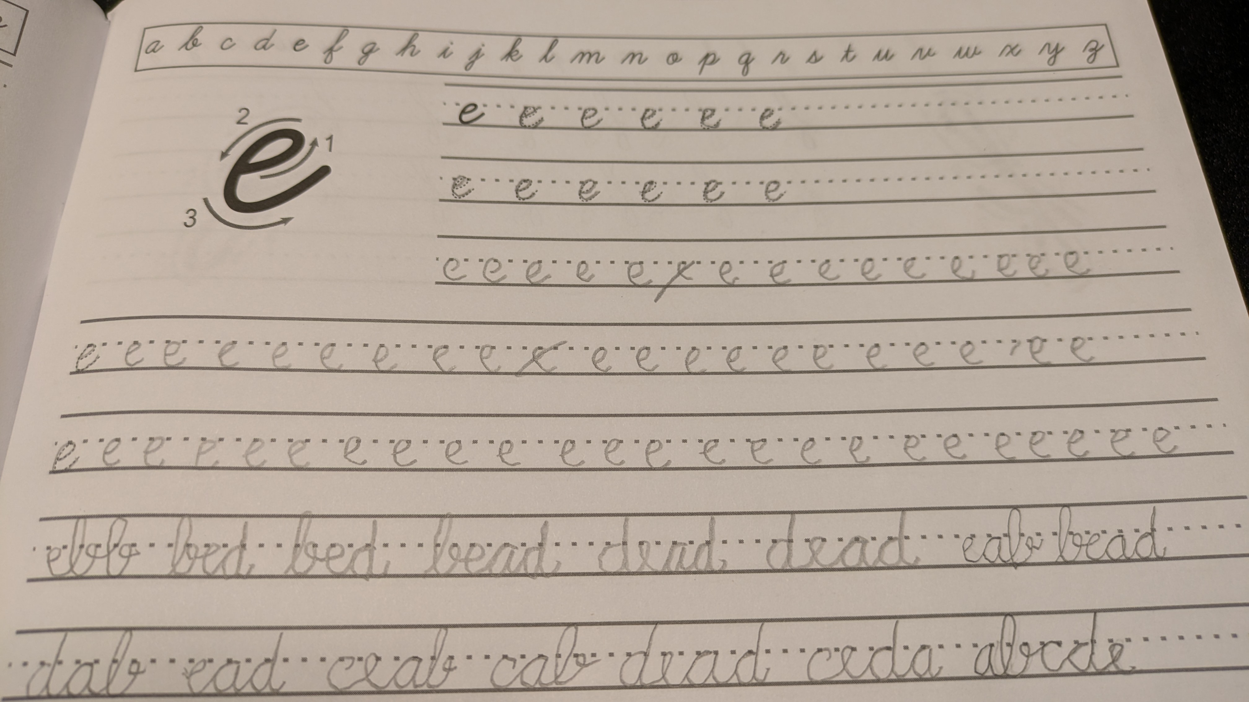 Wow did I struggle with my left-handed cursive today. Who would have thought that a little squiggly line could be so difficult. I was feeling very confident going into the exercise but the lower-case e’s humbled me. I pushed through and in the end I felt a lot better about my ability but I know I have a long way to go.