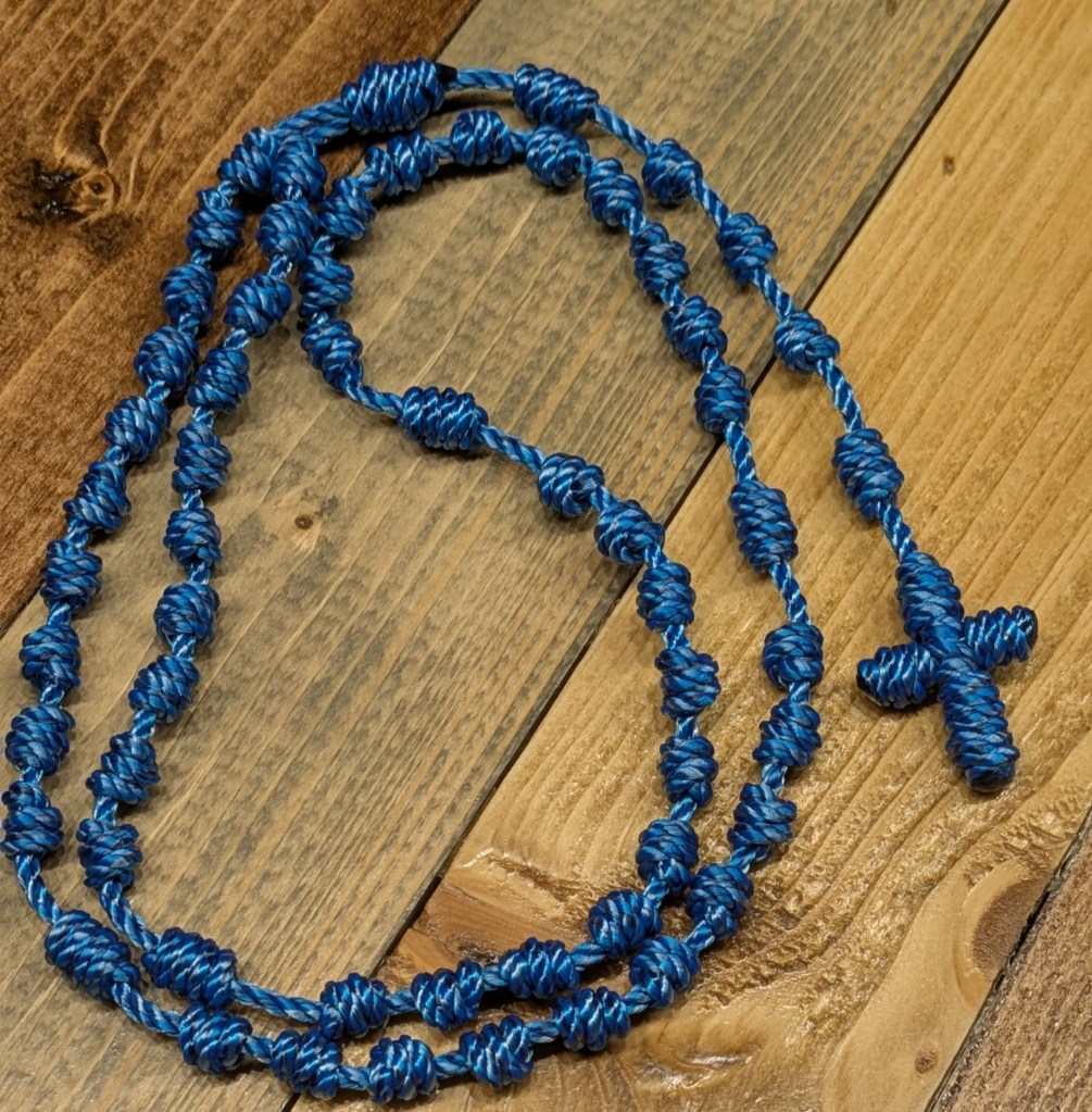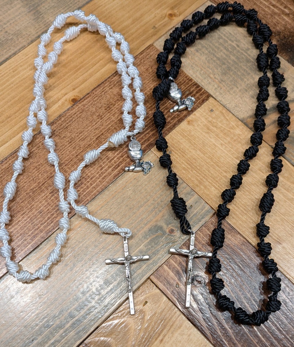 These beautiful, durable, handcrafted cord-knot rosaries will last a life-time. They include a metal crucifix and First Communion medal attached with high-quality split-rings ensuring they’ll never become separated.